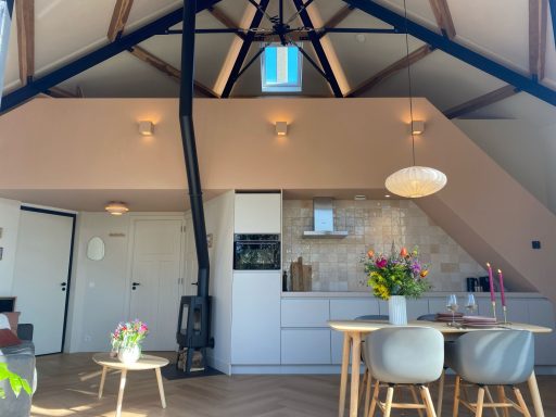 'De Hooischuur' is een stijlvol en comfortabel vakantiehuisje, perfect voor een gezellig uitje met z’n tweeën. Het is een charmant huisje dat ooit een hooischuur was. In de goed uitgeruste keuken vindt u alles wat u nodig heeft. De woonkamer met openslaande deuren naar het terras nodigt uit om lekker buiten te genieten. De sfeervolle slaapkamer op de entresol is de ideale plek om tot rust te komen. Het huisje is voorzien van vloerverwarming. En er is een haardje voor knusse avonden.